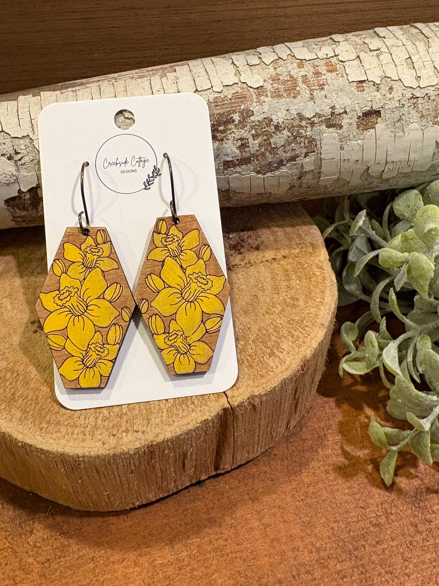 Daffodil Floral Drop Earrings, laser engraved, handpainted, wood earrings, nickel free