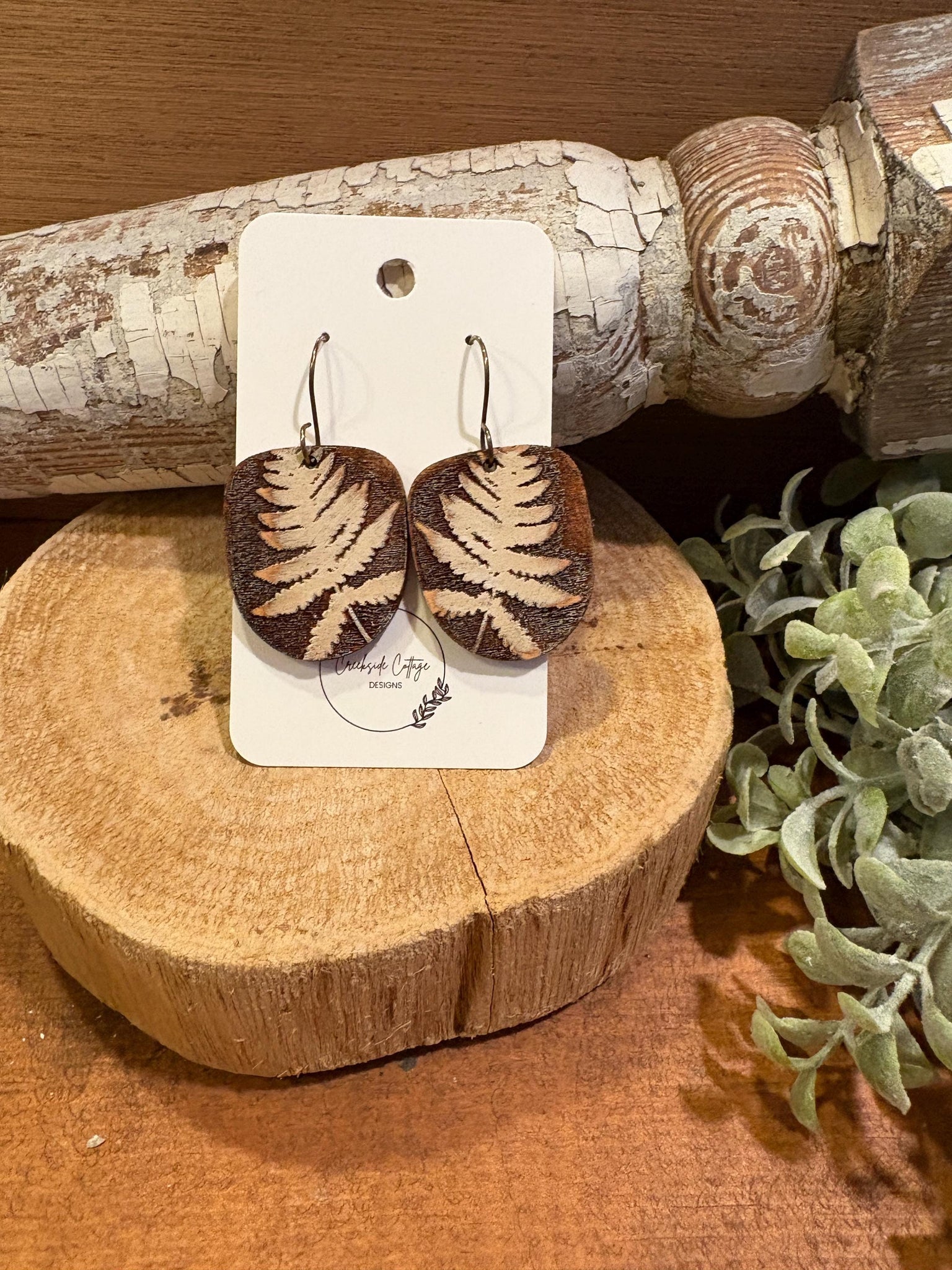 A wonderful everyday reverse engrave fern with a u shape. These earrings are made from quality maple, walnut or baltic birch wood, cut with our laser and then hand stained and painted.