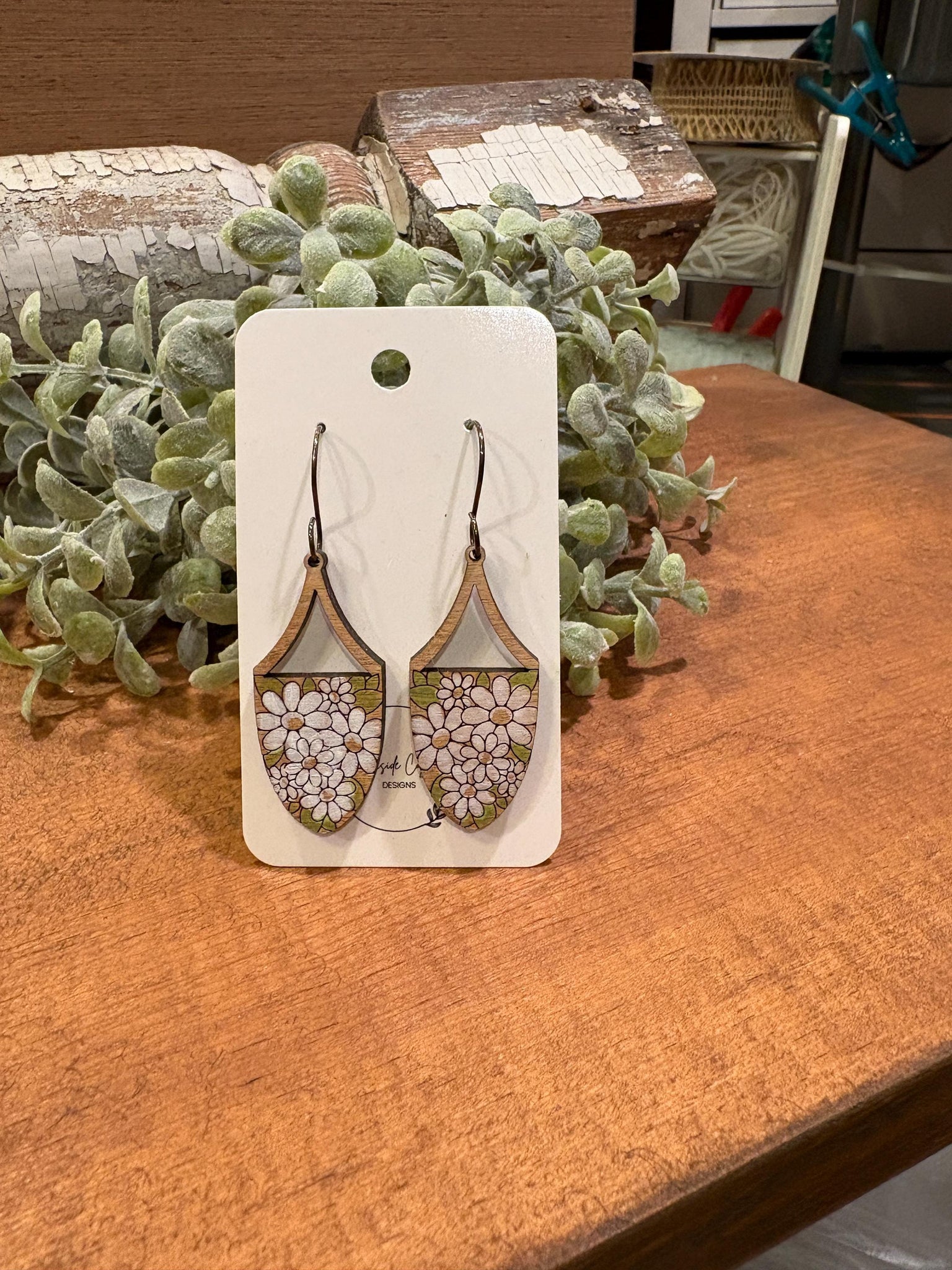 An adorable Hanging Daisy Leaves drop earrings. These earrings are made from quality maple, walnut or baltic birch wood, cut with our laser and then hand stained and painted. This design features a waterbased provincial stain and handpainted detail. Lightweight and easy to wear! All of our earrings are made with stainless steel, hypoallergenic and nickel free findings.